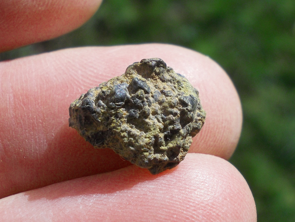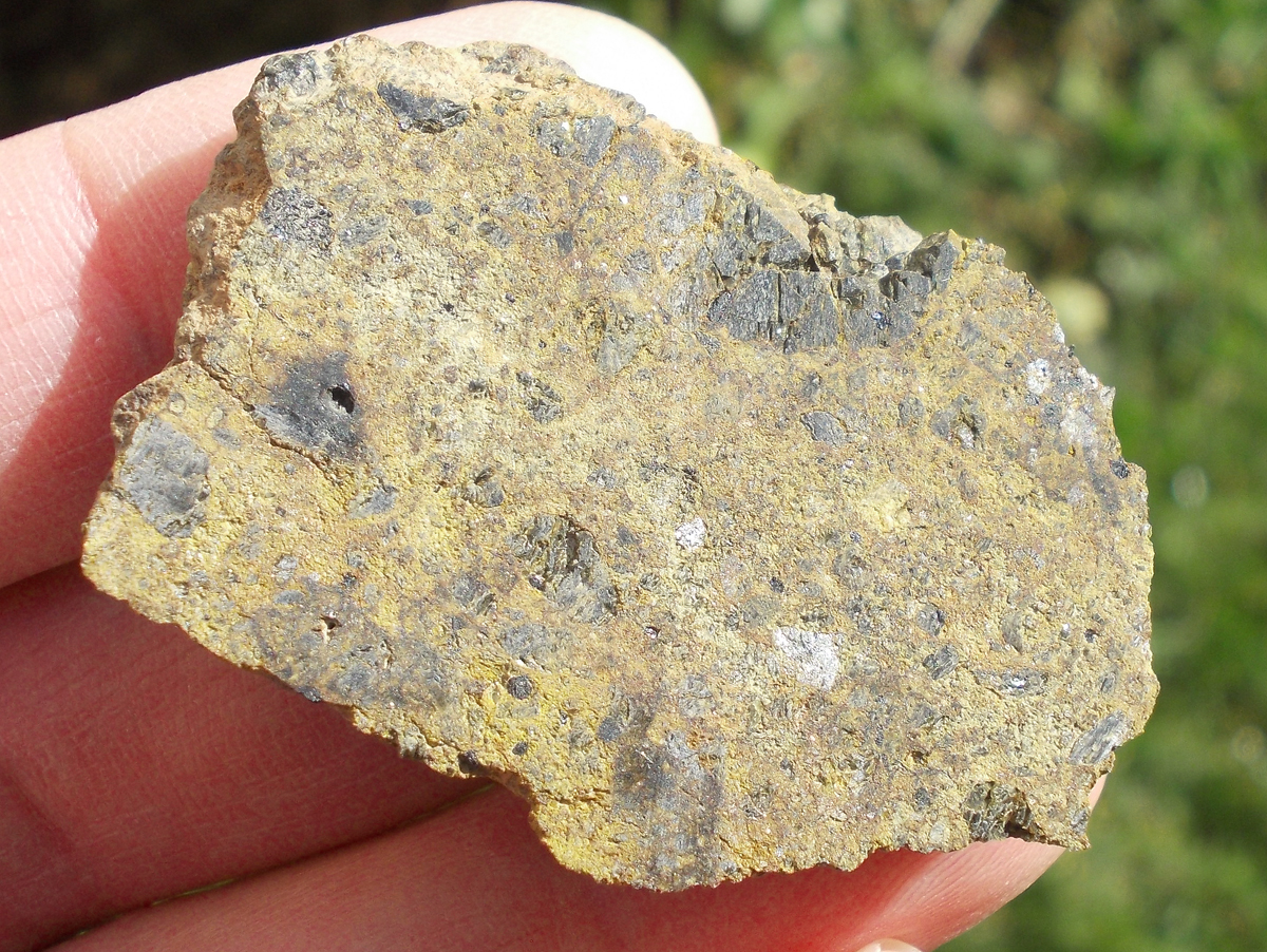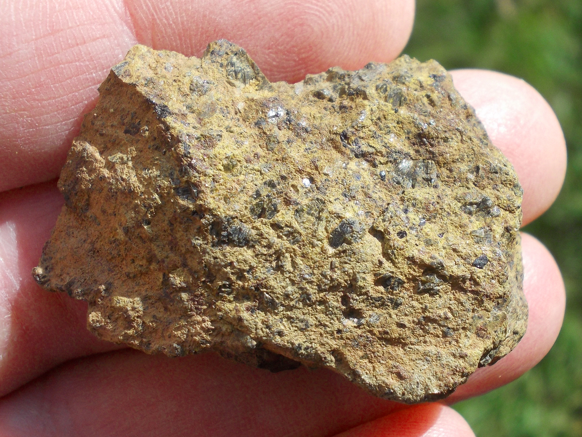 Physical characteristics: The total collected mass was approximately 2 kg. The deposit samples display an exterior partially covered with dark, slightly abraded fusion crust. Sawcut surface reveals many distinctive mm-sized brown-green olivine phenocrysts set in light tan-colored, fine-grained groundmass.