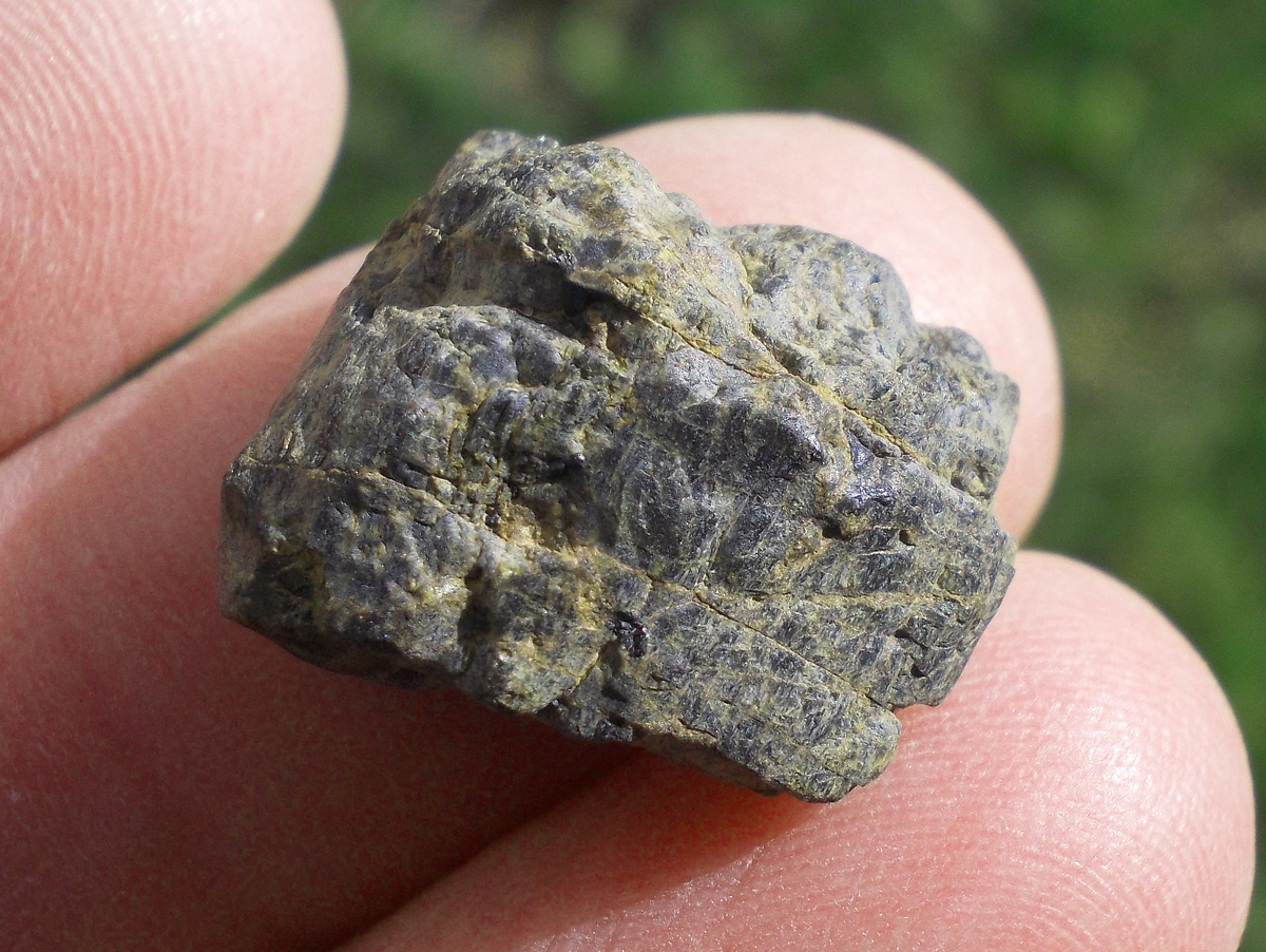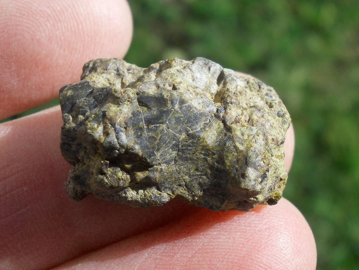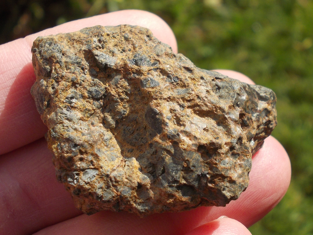 Physical characteristics: The total collected mass was approximately 2 kg. The deposit samples display an exterior partially covered with dark, slightly abraded fusion crust. Sawcut surface reveals many distinctive mm-sized brown-green olivine phenocrysts set in light tan-colored, fine-grained groundmass.