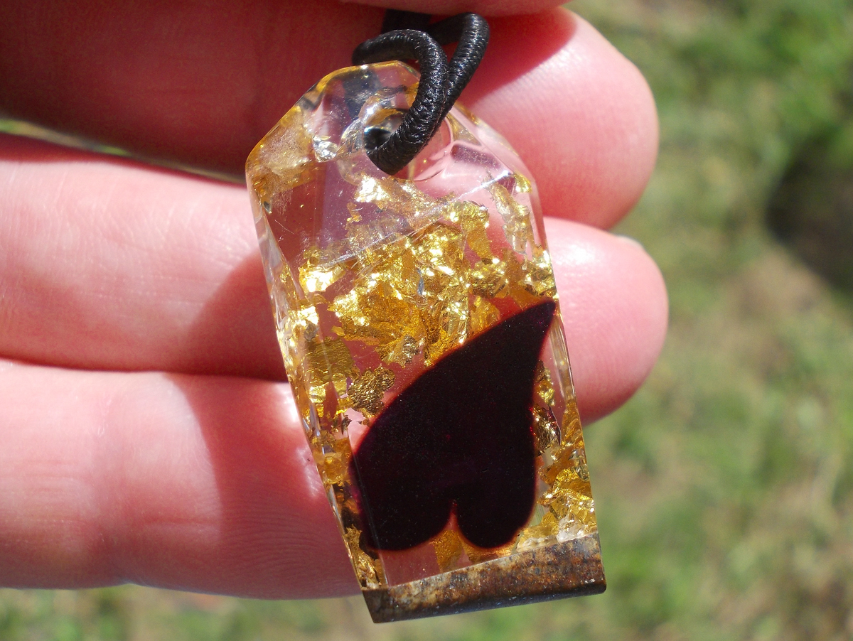 Le bijou en forme de cœur est en polycarbonate avec des feuilles d’or.