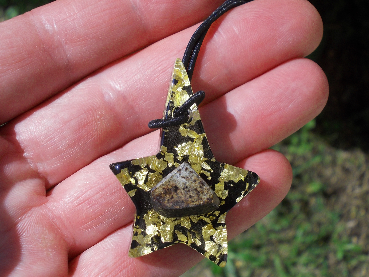 Un morceau de 1,7 gramme de météorite type chondrite ordinaire a été incorporé dans ce bijou.