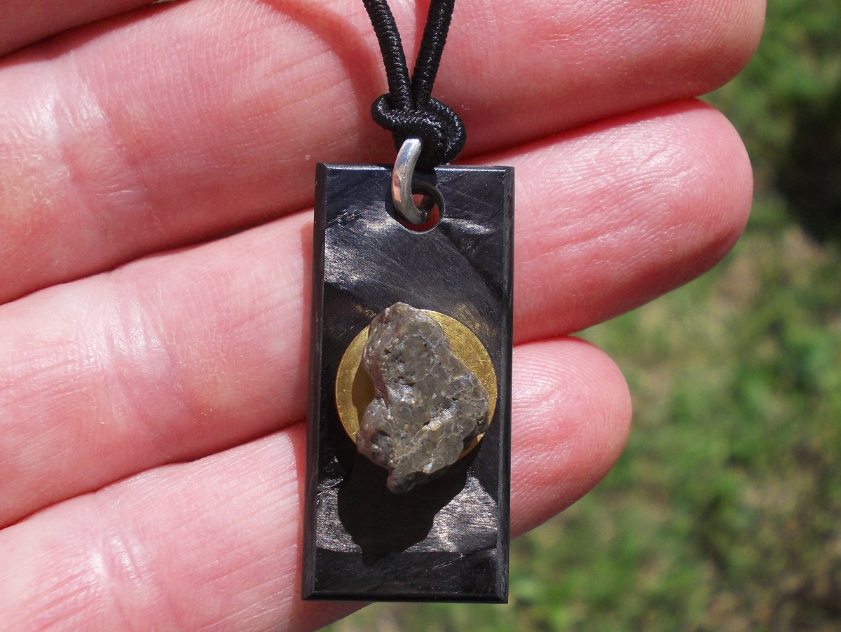 La plaque noire rectangulaire du pendentif a été forgée dans de la fibre de carbone utilisée dans l’aéronautique, et la pastille d’argent plaqué or est une pièce d’un radar d’un avion Mirage 3.