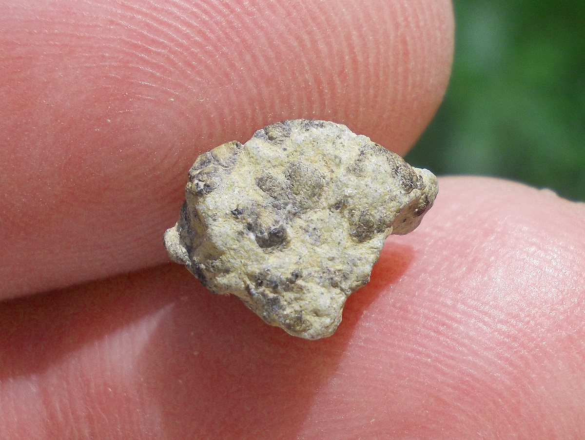 Physical characteristics: The total collected mass was approximately 2 kg. The deposit samples display an exterior partially covered with dark, slightly abraded fusion crust. Sawcut surface reveals many distinctive mm-sized brown-green olivine phenocrysts set in light tan-colored, fine-grained groundmass.