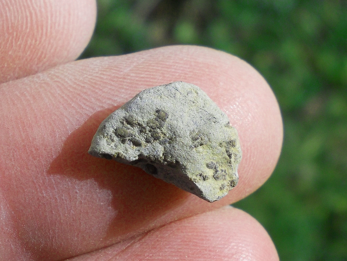 Physical characteristics: The total collected mass was approximately 2 kg. The deposit samples display an exterior partially covered with dark, slightly abraded fusion crust. Sawcut surface reveals many distinctive mm-sized brown-green olivine phenocrysts set in light tan-colored, fine-grained groundmass.